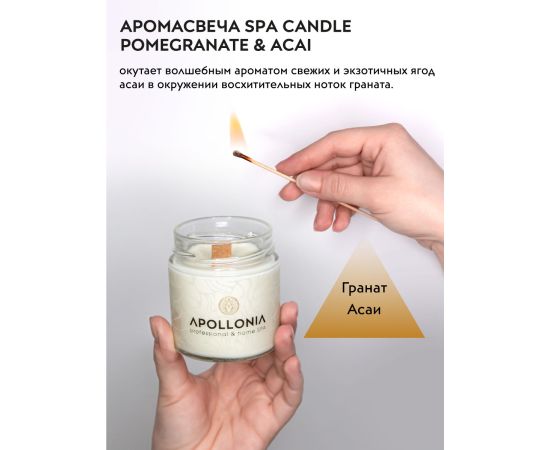 Аромасвеча APOLLONIA SPA CANDLE POMEGRANATE & ACAI окутает волшебным ароматом свежих и экзотичных ягод асаи в окружении восхитительных ноток граната, прекрасно впишется в интерьер, станет не только атрибутом вашего домашнего SPA, но и отличным подарком на любые праздники. Деревянный фитиль напомнит потрескивание дров в камине и подарит приятные ощущения уюта и гармонии.