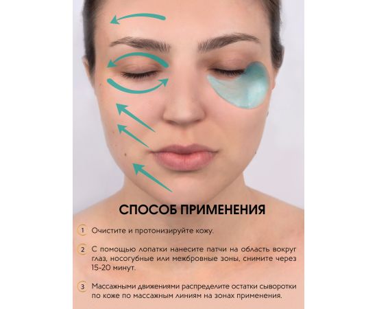 Очистите и протонизируйте кожу. С помощью лопатки нанесите патчи на область вокруг глаз, носогубные или межбровные зоны, снимите через 15-20 минут. Массажными движениями распределите остатки сыворотки по коже