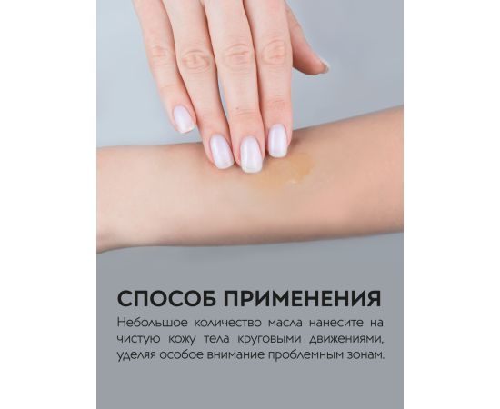 Небольшое количество масла нанесите на чистую кожу тела круговыми движениями, уделяя особое внимание проблемным зонам. Можно использовать в качестве средства для ухода за кожей тела после принятия ванны или душа.