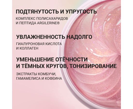Разглаживающие лифтинг-патчи придают коже упругость и выравнивают микрорельеф, создавая ощущение гладкости и мягкости. Комплекс полисахаридов и пептида ARGILERINE придают коже подтянутость, а гиалуроновая кислота и коллаген в составе надолго обеспечивают увлажнённость кожи. Экстракты комбучи, гамамелиса и кофеина мгновенно тонизируют кожу, уменьшают отёчность и тёмные круги, придают коже естественное сияние.