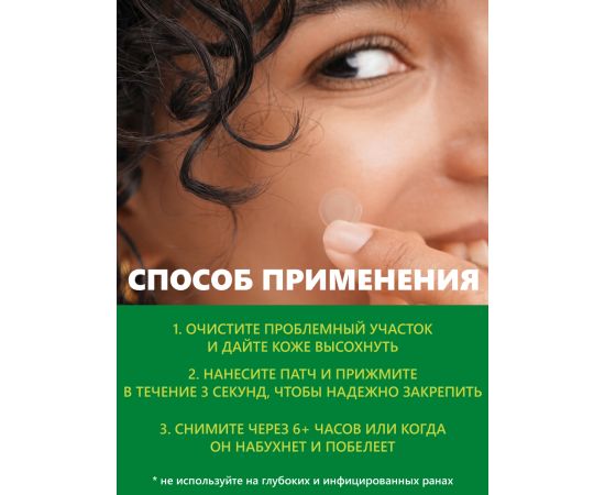 Гидроколлоидные патчи с высоким уровнем абсорбции 700%* поглощают экссудат из области воспаления и помогают свести к минимуму образование рубцов. Начинают действовать сразу после нанесения и обеспечивают мгновенное облегчение. Благодаря ультратонким скошенным краям и прозрачной матовой поверхности идеально подходят для всех оттенков кожи и незаметны. Надежно прилегают к коже в течение длительного времени, даже во время умывания, плавания и под макияжем. Дерматологически протестировано.