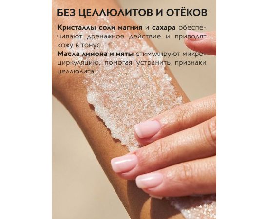Скраб для тела деликатно отшелушивает кожу, устраняет сухость, а также моделирует контуры тела. Массажные движения в сочетании с кристаллами соли магния и сахара обеспечивают дренажное действие, уменьшают выраженность целлюлита, повышают тонус кожи и снимают напряжение с мышц. Экстракт белой ивы уменьшает видимость растяжек и следов постакне. Масло ши питает и повышает эластичность кожи, делает её гладкой и шелковистой. Эфирные масла лимона и мяты тонизируют и стимулируют микроциркуляцию, помогая устранить признаки целлюлита.